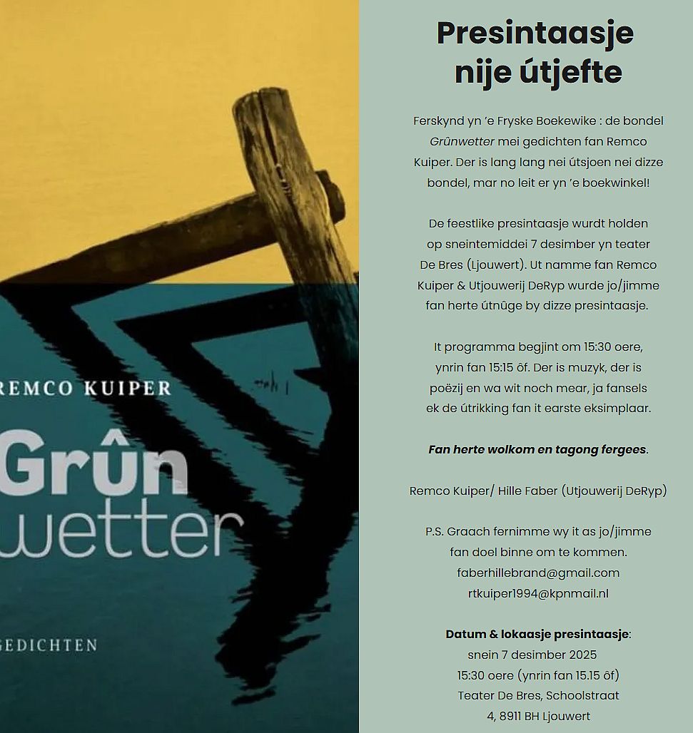 Maar het gaat me nu even om het omslag. De vormgever heeft daarop de zwart-witfoto kleur gegeven: okergeel aan de bovenkant en donkergroen aan de onderkant. Op de achterkant lopen die kleuren door, met een flaptekst in witte letters. Op de voorkant heeft de vormgever ook iets gedaan met de letters van de titel: het eerste deel van het samengestelde woord ‘Grûnwetter’ staat in dikkere grijze letters boven het tweede deel. Dat geeft al wat te denken voordat je de bundel opengeslagen hebt. En ook al heb ik geen ruimte om posters op te hangen, ik zou deze omslag best in posterformaat willen zien.